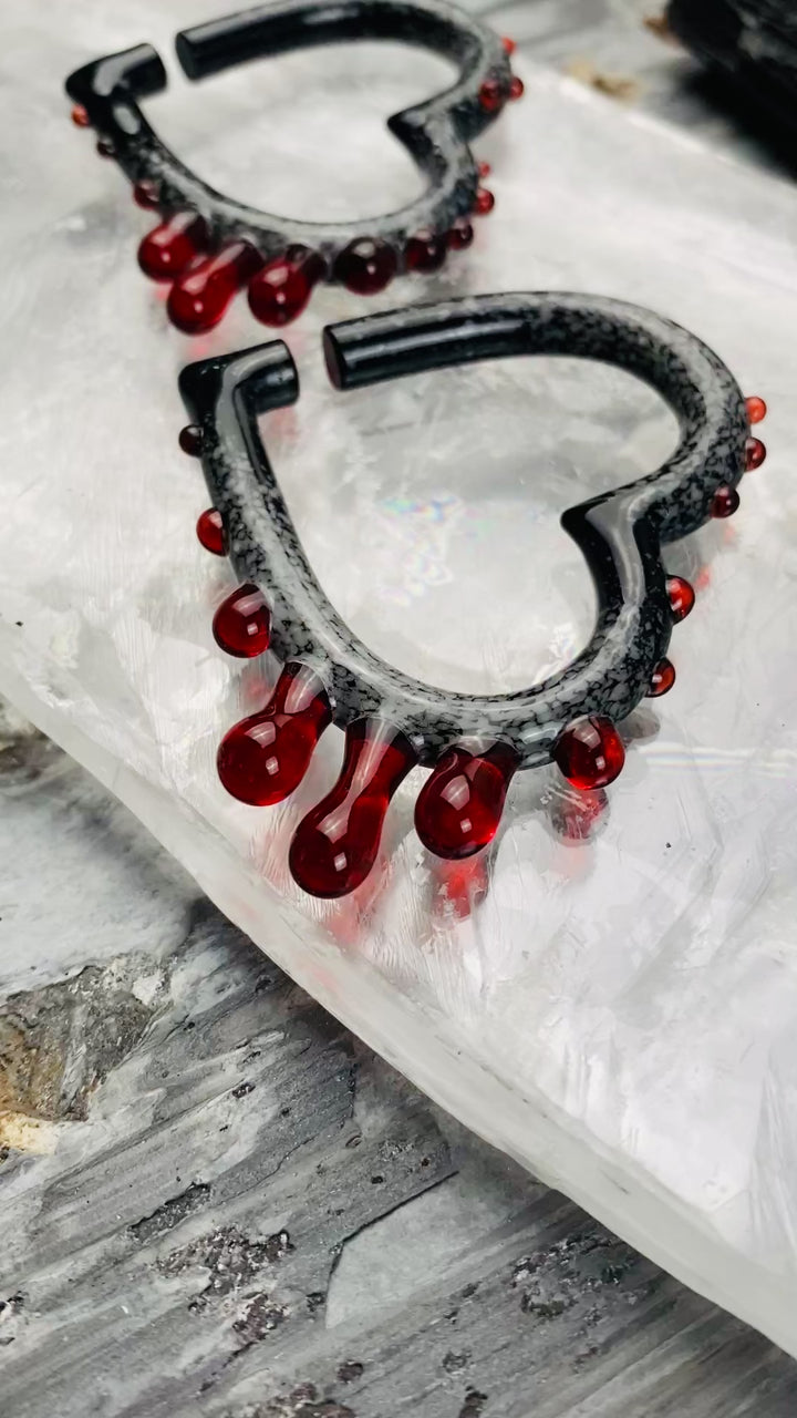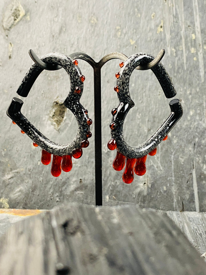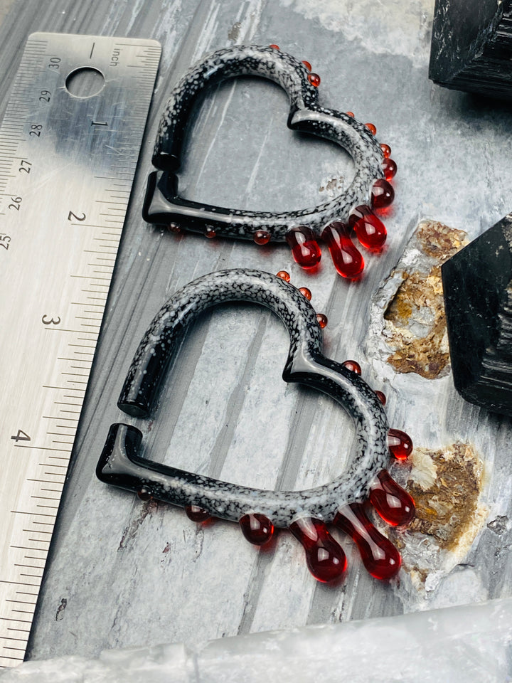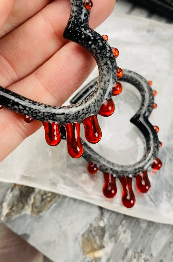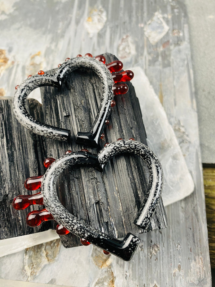 COLOR NOTES: Blood red glass drips from solid black glass that is freckled with snow white flakes. The black glass is carefully rolled in crushed white glass while molten hot. The crushed glass is melted into the black to create the look of powdered snow. The glass is then shaped into hearts and a blood red glass is added to look like the hearts are bleeding.